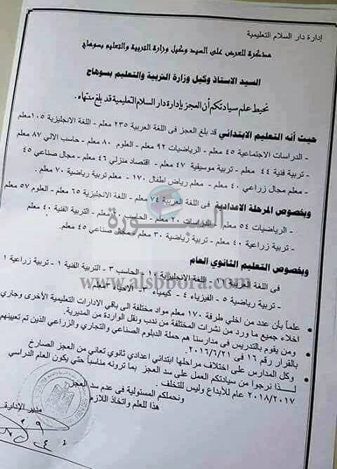وتم عرض مذكرة على وكيل وزارة التربية والتعليم بسوهاج، واتضح من هذه المذكرة ان عجز المعلمين في ادارة دار السلام بسوهاج حوالى 1592 معلما في جميع المراحل التعليمية المختلفة، منهم عجز 1106 معلمين فى المرحلة الابتدائي ، و445 معلما في المرحلة الاعدادية، و41 معلما فى المرحلة الثانوية، ولم يتم سد هذا العجز حتى بداية العام الدراسي الحالى 2017/2018.
