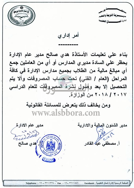 أصدرت ادارة شمال التعليمية أمرا اداريا هاما بشأن منع مديرى المدارس والمعلمين من جمع اى مبالغ مالية من الطلاب بجميع مدارس الادارة فى كافة المراحل "العام أو الفنى".