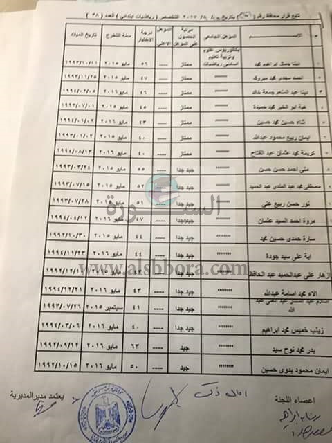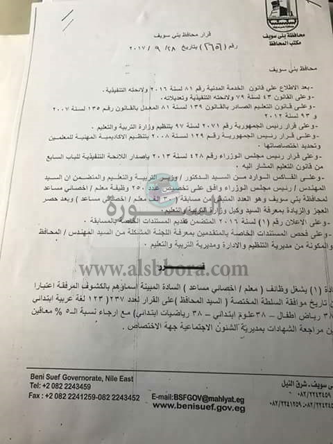 صرحت سهام يوسف عبد الله القائم باعمال وكيل وزارة التربيه والتعليم ببنى سويف بأن المهندس شريف حبيب محافظ بني سويف قد اعتمد نتيجة التعاقد مع 250معلما في تخصصات (لغة عربية ورياضيات وعلوم ورياض اطفال ) بالقرار رقم2656بتاريخ 28/9/2017