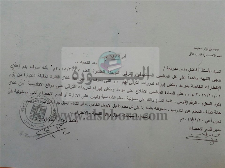 يرجى التنبية على كل المعلمين المستهدفين للرتقى للمرحلة العاشرة للعام 2018/2017 بانه سوف يتم اعلان الاخطارات اللخاصة بموعد ومكان اجراء تدريبات الترقى لهم والتى سوف يتم اجرائها خلال الفترة المقبلة اعتبارا من يوم 2017/10/1.