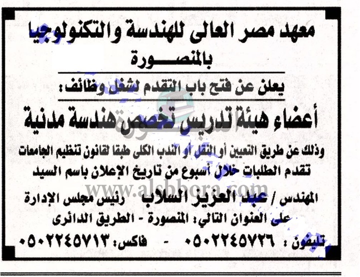 عاجل.. معهد مصر العالى بالمنصورة عن حاجتها الى أعضاء هيئة التدريس.. ننشر نص الاعلان