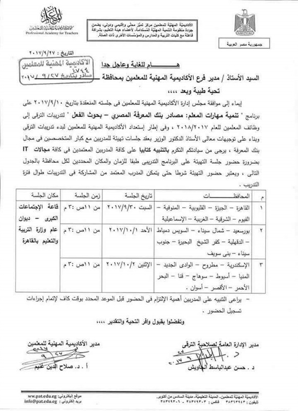 على ان يكون التدريب على تنمية مهارات المعلم من خلال بنك المعرفه المصرى ، وذلك فى اطار استعداد اكاديمية المعلمين لتدريبات الترقيه ، بناء على توجيهات وزير التعليم