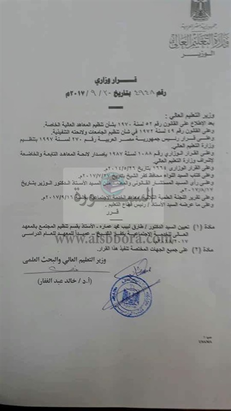 أصدر الدكتور خالد عبد الغفار وزير التعليم العالى والبحث العلمى، القرار رقم 4948 بتاريخ 30 / 9 2017م بتعيين الدكتور طارق لبيب محمد عمارة، الأستاذ بقسم تنظيم المجتمع بالمعهد العالى للخدمة الإجتماعية بكفرالشيخ، عميداً للمعهد للعام الدراسي 2017 / 2018 م .