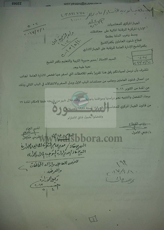 يفتح موقع السبورة ملف فساد شائك فى مديرية التعليم بكفر الشيخ، حيث كشف تقرير الجهاز المركزي للمحاسبات الادارة المركزية للرقابة على محافظات وسط وغرب الدلتا قطاع شئون العاملين بكفر الشيخ عن فحص بعض اعمال شئون العاملين وجانب من مستندات الباب الاول وبدل السفر والانتقالات في الباب الثاني عن المدة من اكتوبر 2016 ولم يتم الرد على الملاحظات حتى تاريخه؟؟ التقرير يحمل رقم 502 في 1 مارس الماضي.