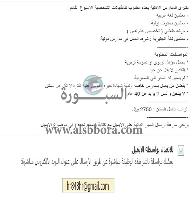 تعلن مدرسة خاصة في المملكة العربية السعودية عن وظائف جديدة للمعلمين والمعلمات وذلك وفقا لنص الإعلان التالي:-
