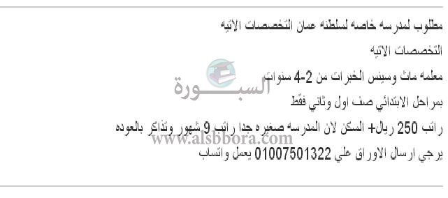 تعلن مدرسة خاصة في سلطنة عمان تعلن عن وظائف جديدة للمعلمين والمعلمات وذلك وفقا لنص الإعلان التالي:-