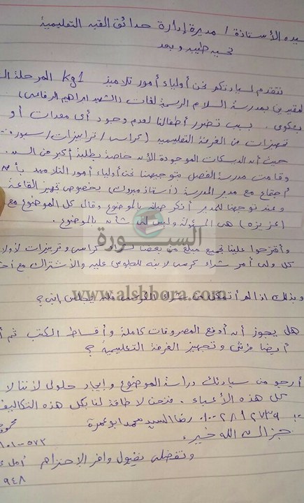 وأوضحت "سجلت اعتراضي ومعي آخرين أمام مبروك إبراهيم مدير المدرسة، والذي بدوره أكد أن الإدارة التعليمة أرسلت إشارة، توضح فيها أن تجهيز الفصل سيكون من خلال "المشاركة المجتمعية"، قائلا "أنا مليش فيه".