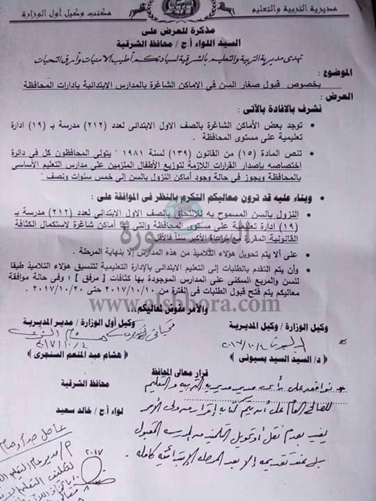 أصدر هشام السنجرى وكيل وزارة التربية والتعليم بالشرقية قرارا بالنزول بسن قبول طلاب الصف الأول الابتدائى فى 212 مدرسة .