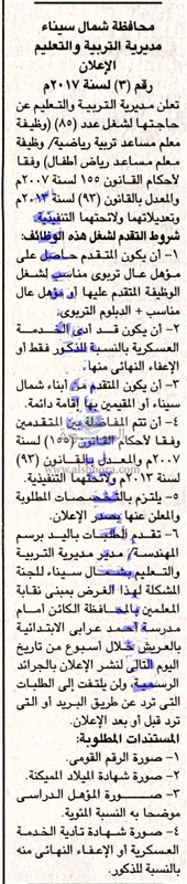 أعلنت وزارة التربية والتعليم والتعليم الفنى عن حاجة مديرية التربية والتعليم بشمال سيناء الى معلمين مساعدين، التقدم بالطلبات الى مدير مديرية التربية والتعليم بشمال سيناء، ولمزيد من التفاصيل عبر الاعلان التالى والمنشور فى جريدة الجمهورية اليوم الأربعاء الموافق 11 أكتوبر 2017.