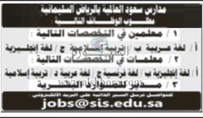 تعلن مدارس سعود العالمية بالرياض السليمانية بالمملكة العربية السعودية عن حاجتها الى معلمين ومعلمات بعده تخصصات متنوعة، وعلى الراغبين فى التقدم ارسال السيرة الذاتية على الايميل المنشور فى الاعلان التالى: