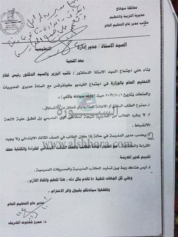 أخبار التعليم عاجل وبالمستندات.. أمر إدارى واجب التنفيذ لمديريات التربية والتعليم كتب - محمود دهشورى الأربعاء 11/أكتوبر/2017 - 12:26 م facebook twitter whats x facebook twitter rss feed facebook twitter whats