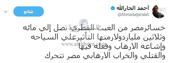 وأضاف رئيس تحرير جريدة السياسة الكويتية، فى تدوينه له عبر حسابه على تويتر، أن خسائر مصر العبث القطرى تصل إلى 130 مليار دولار، منها التأثير على السياحة وإشاعة الإرهاب وفعله فيها، والقتلى والخراب الإرهابى، مصر تتحرك.