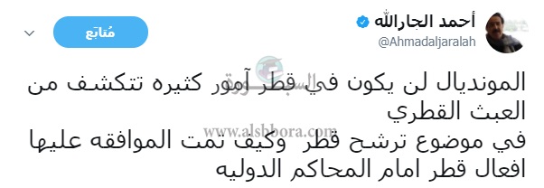 وقال الكاتب الكويتي: "المونديال لن يكون فى قطر، أمور كثيرة تتكشف من العبث القطرى، فى موضوع ترشح قطر وكيف تمت الموافقة عليها، أفعال قطر أمام المحاكم الدولية".