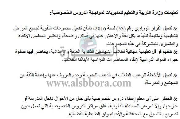 تنشر"السبورة" تعليمات وزارة التربية والتعليم للمديريات لمواجهة الدروس الخصوصية وهي كالتالي: