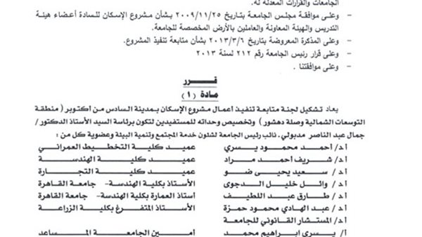 وحمل قرار رئيس الجامعة رقم 796 لسنة 2013، وتضمن إسناد رئاسة اللجنة إلى الدكتور جمال عبد الناصر مدبولى، نائب رئس الجامعة لشئون خدمة المجتمع وتنمية البيئة.