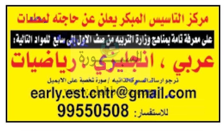 تعلن مدرسة خاصة في دولة الكويت تعلن عن وظائف جديدة للمعلمين والمعلمات وذلك وفقا لنص الإعلان التالي:-