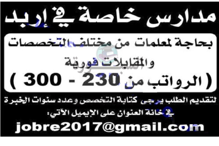 بمرتبات تصل إلي 300 دينار| مدارس إربد تعلن عن وظائف جديدة للمعلمين والمعلمات في جميع التخصصات.. ننشر نص الإعلان