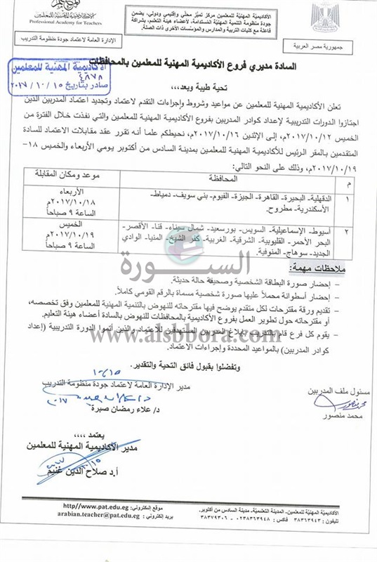 تعلن الاكاديمية المهنية للمعلمين عن مواعيد وشروط واجراءات التقدم لاعتماد المدربين الذين اجتازوا الدورات التدريبية لاعداد كوادر المدربين بفروع الاكاديمية المهنية للمعلمين والتى نفذت خلال الفترة من الخميس 12 أكتوبر الى الاثنين 16 أكتوبر الجارى، حيث تقرر عقد مقابلات الاعتماد للمتقدمين بالمقر الرئيسى للاكاديمية المهنية للمعلمين بمدينة السادس من أكتوبر يومى الأربعاء والخميس 2017/10/19/18.