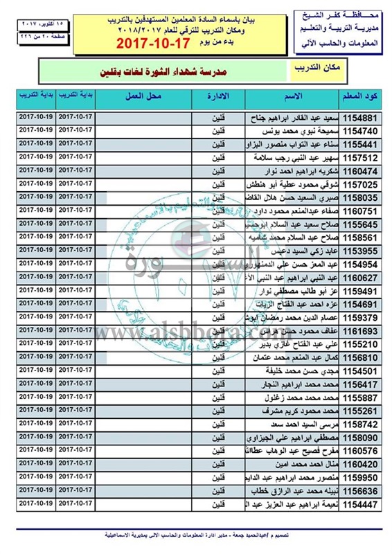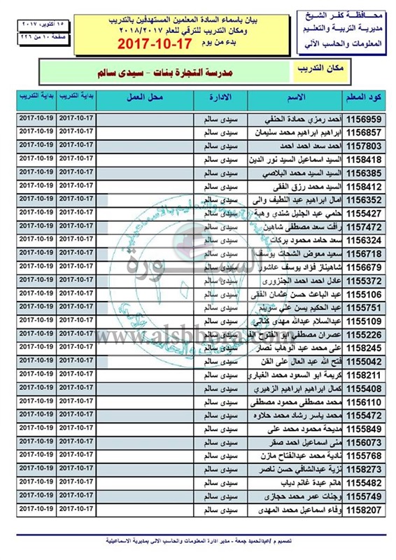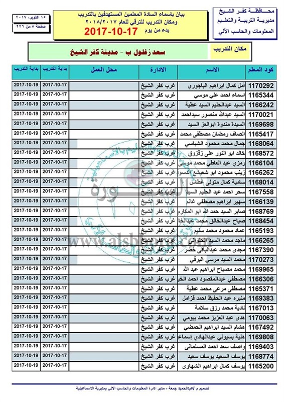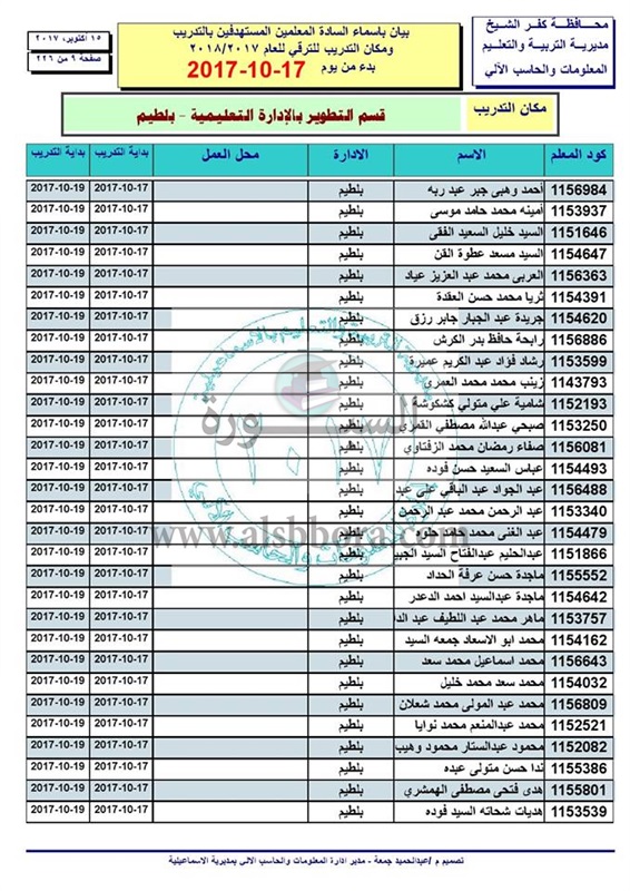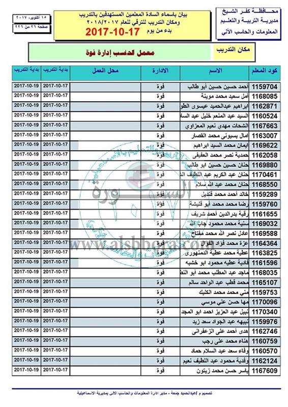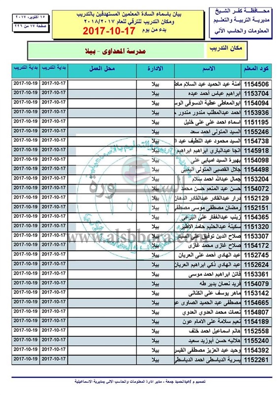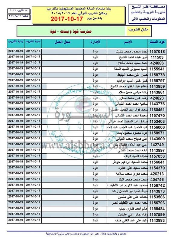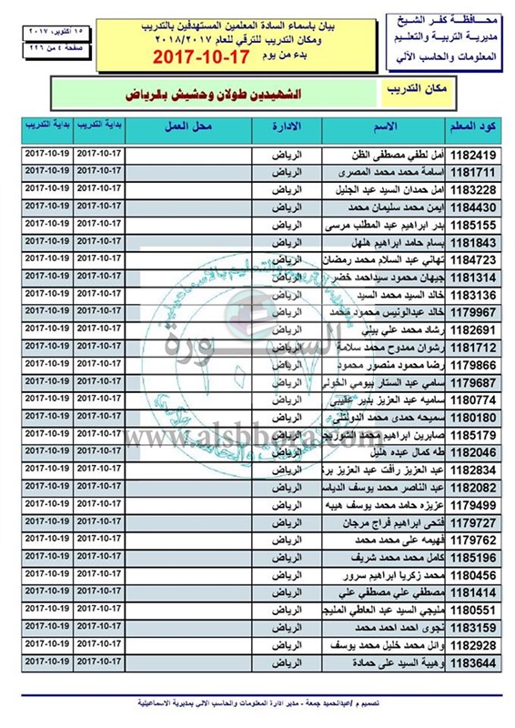 ننشر أسماء المعلمين والاخصائيين المستهدفين للتدريب من أجل الترقى بدء من 17 الى 2017/10/19