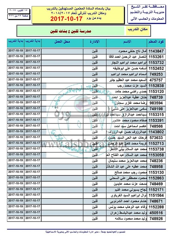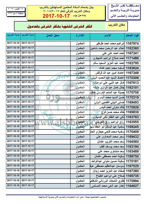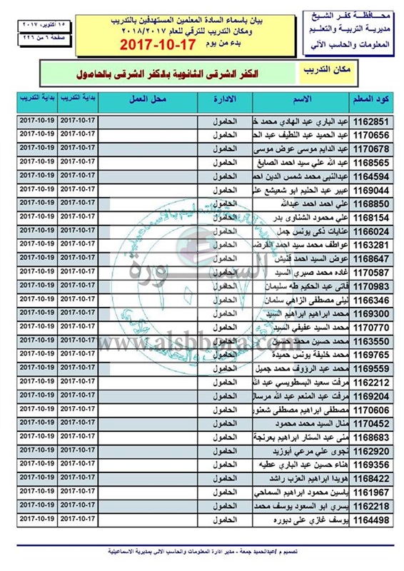 أعلنت مديرية كفر الشيخ عن اسماء المعلمين والاخصائيين المستهدفين بالتدريب ومكان التدريب للترقي عام 2018/2017 بدء من يوم 2017/10/17 الى 2017/10/19 وذلك ابتداء من الساعة التاسعة صباحاً.