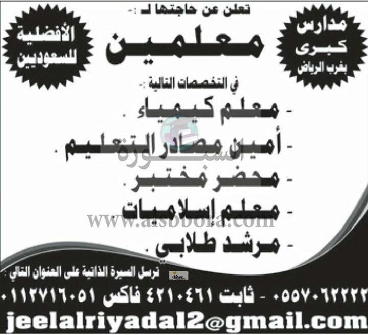 تعلن كبرى المدارس بغرب الرياض بالمملكة العربية السعودية عن حاجتها الى معلمين مصريين، وعلى الراغبين فى التقدم ارسال السيرة الذاتية عبر الايميل المنشور فى الاعلان التالى: