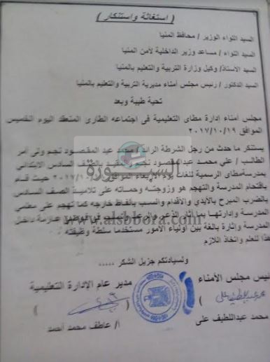 وتلخص محضر الاجتماع في مخاطبة عاجلة للسيد اللواء عصام البديوي محافظ المنيا والسيد اللواء مساعد وزير الداخلية لأمن المنيا ووكيل وزارة التربية والتعليم ورئيس مجلس الأمناء بالمحافظة بضرورة اتخاذ خطوات جادة وسريعة لإنهاء الموقف لصالح كرامة المعلمين والتلاميذ وأولياء الأمور