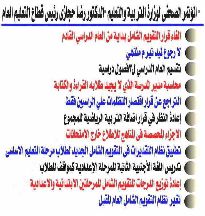 عقد الدكتور رضا حجازى رئيس قطاع التعليم العام اليوم مؤتمرًا صحفيًا لتوضيح بنود القرار رقم (377) بشأن تعديل بعض مواد القرار الوزارى رقم (313) لسنة 2011 الخاص بإعادة تنظيم التقويم التربوى الشامل المطبق على مرحلة التعليم الأساسى بحلقتيها الابتدائية والإعدادية، بحضور أحمد خيرى المتحدث الرسمى للوزارة، ويسرى سويرس مدير عام تنمية مادة العلوم، وجوزال فتحى مدير عام التعليم الإعدادى.