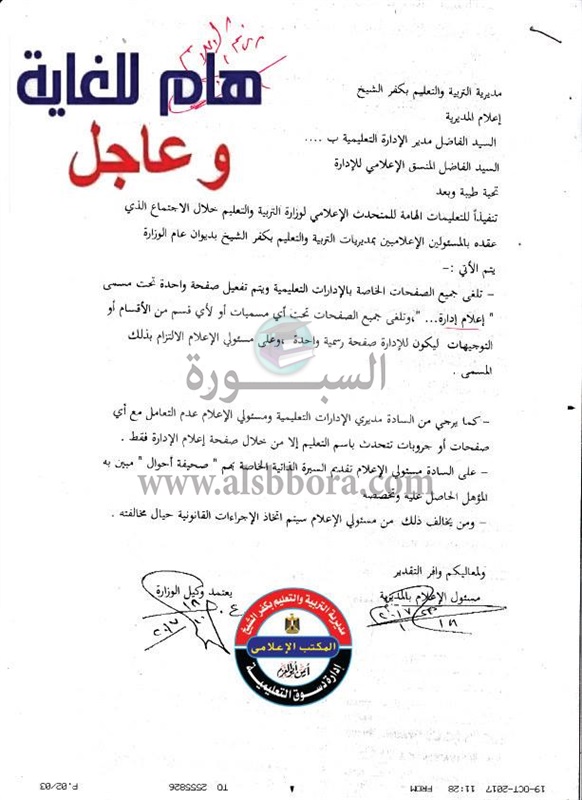 أصدرت مديرية التربية والتعليم بكفر الشيخ بيانا هاما الى جميع الادارات التعليمية بالغاء جميع صفحات التواصل الاجتماعى "فيسبوك"، وتفعيل صفحة واحدة رسمية فقط تحت مسمى "إعلام إدارة".
