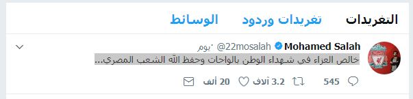 نعى محمد صلاح لاعب ليفربول الانجليزى ومنتخب مصر القومى لكرة القدم شهداء الشرطة فى حادث الواحات الإرهابى عبر تويتر حيث نشر تغريدة له على صفحته الرسمية "خالص العزاء في شهداء الوطن بالواحات وحفظ الله الشعب المصري..."