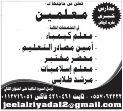 مدارس كبرى بالرياض تعلن عن حاجتها الى معلمين لمختلف التخصصات..ننشر نص الاعلان