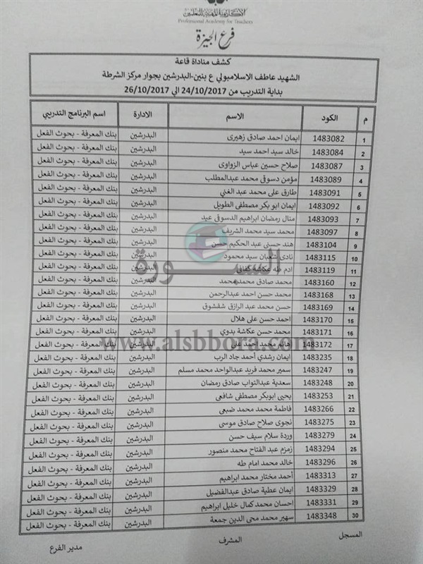 كشوف مناداة قاعات تدريبات إدارة البدرشين التعليمية لترقية المعلمين بداية التدريب من الثلاثاء 2017/10/24 إلى الخميس 2017/10/26.
