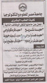 تعلن جامعة مصر للعلوم والتكنولوجيا عن حاجتها الى معيدين، وعلى الراغبين فى التقدم للوظيفة تسليم الطلب الى مكتب عميد الكلية باليد على العنوان المنشور اسفل الاعلان.