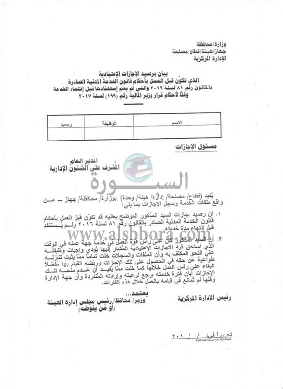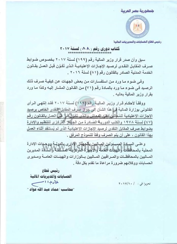 أصدرت وزارة المالية كتابا دوريا ونموذج بشأن ضوابط صرف المقابل النقدى لرصيد الاجازات الاعتيادية الذى تَكَوْن قبل العمل بالقانون رقم (81) لسنة 2016.