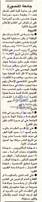 تعلن جامعة المنصورة عن وظائف جيدة لأعضاء هيئة التدريس"من حملة الماجستير والدكتوراه " علما بأن أخر موعد للتقدم 2 نوفمبر وذلك وفقا لنص الإعلان التالي:-