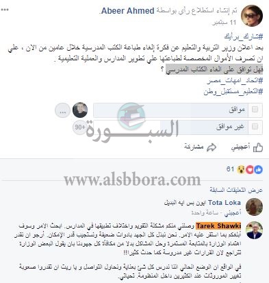 رد الدكتور طارق شوقي، وزير التربية والتعليم، على أعضاء جروب اتحاد أمهات مصر للنهوض بالتعليم،على استطلاع رأى أجرته إحدى أولياء الأمور، بسؤال "هل توافق على إلغاء الكتاب المدرسى بعد نية الوزارة لإلغائه خلال العامين المقبلين؟".