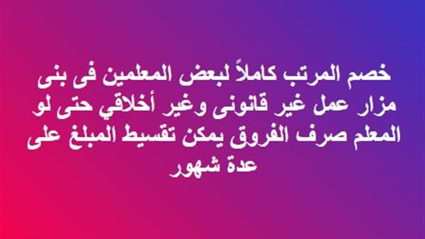 وأوضح نشطاء التعليم أن على الادارة أن تقوم بخصم المبلغ المستحق لهم على المعلمين عن طريق اقساط شهرية وليس خصم المرتب بأكمله.