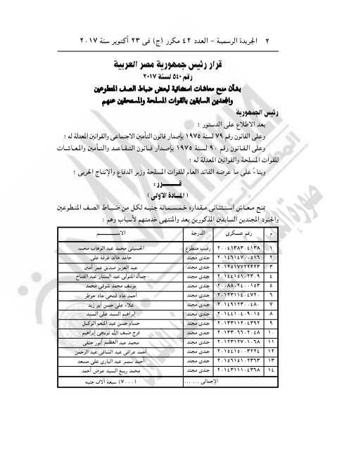 نشرت الجريدة الرسمية، قرارًا جمهوريًا للرئيس عبد الفتاح السيسي، حمل رقم 540 لسنة 2017، بشأن منح معاشات استثنائية لبعض ضباط الصف المتطوعين والمجندين السابقين بالقوات المسلحة والمستحقين عنهم.