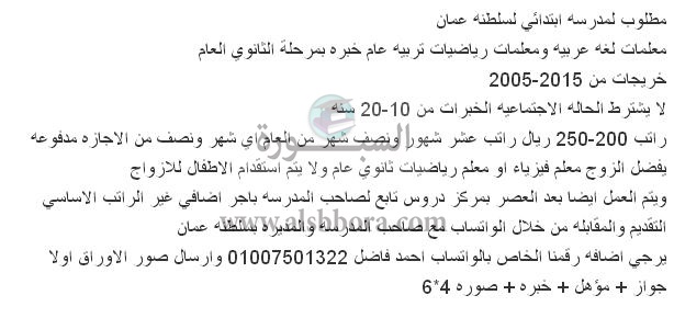 تعلن سلطنة عمان عن وظائف جديدة للمعلمين والمعلمات وذلك بمرتبات تصل إلي 9 ألاف جينة وذلك وفقا لنص الإعلان التالي