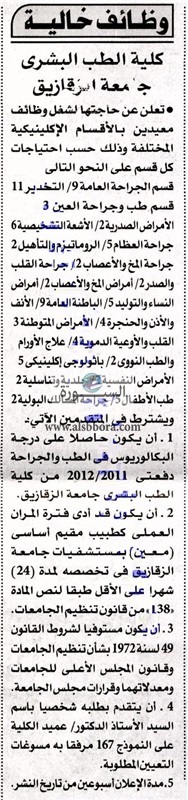 أعلنت جامعة الزقازيق عن وظائف جديدة لأعضاء هيئة التدريس "من حملة الماجستير والدكتوراه " علما بأن أخر موعد للتقديم غدا الاثنين وذلك وفقا لنص الإعلان التالي