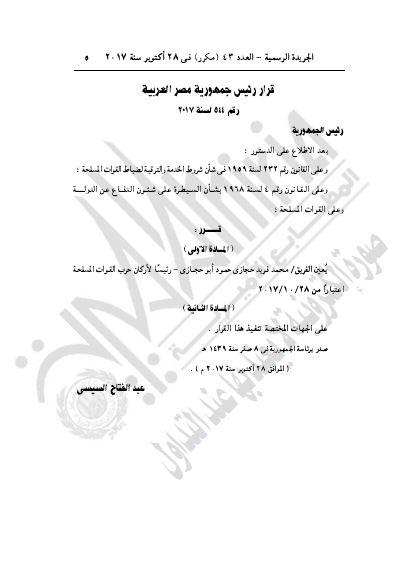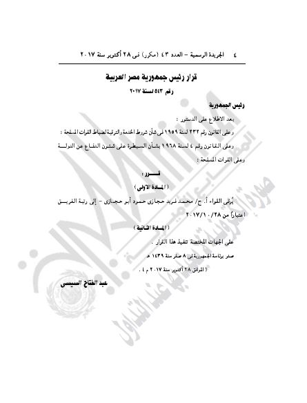 كما نشرت الجريدة الرسيمة قرار رئيس الجمهورية رقم 543 لسنة 2017 بترقية اللواء أركان حرب محمد فريد حجازى إلى رتبة الفريق.