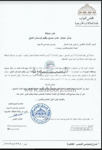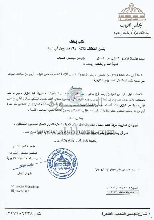 تقدم النائب طارق الخولى أمين سر لجنة العلاقات الخارجية بمجلس النواب بطلبى إحاطة موجهين لوزير الخارجية بشأن احتجاز عامل مصرى بإقليم كردستان العراق واختطاف ثلاثة عمال مصريين في ليبيا حيث جاء نصهما كالتالى: