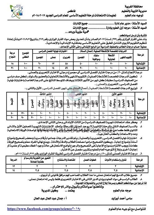 أصدرت وزارة التربية والتعليم فاكسا هاما بشأن تعليمات الامتحانات لمرحلة التعليم الأساسى للعام الدراسى الجديد 2018/2017، والذى جاء كالتالى: