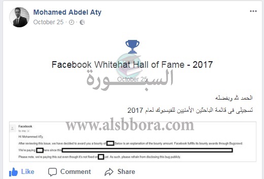 وقام بالتواصل مع ادارة الفيس بوك الذين تأكدوا من حقيقة اكتشافه للثغرة فقرروا مكأفاته بإدراجه ضمن قائمة الشرف ومنحه مكافأة مالية .