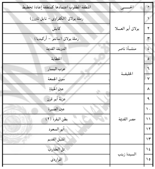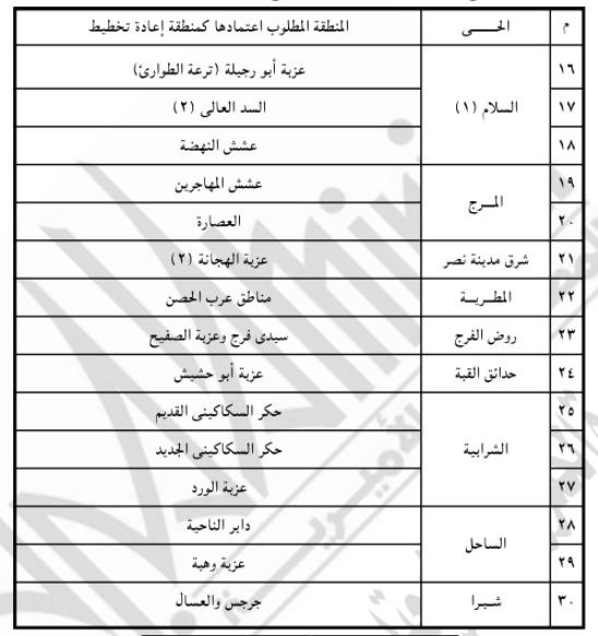 وقرر محافظ القاهرة، تشكيل اللجان المختصة بمناطق إعادة التخطيط وفقا لما نصت عليها اللائحة التنفيذية لقانون البناء رقم 119 لسنة 2008.
