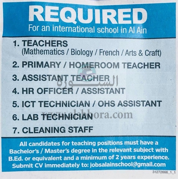 أعلنت كبرى المدارس بالامارات العربية المتحدة عن حاجتها الى معلمين ومعلمات فى جميع التخصصات، وعلى الراغبين فى التقدم ارسال السيرة الذاتية عبر الايميل المنشور فى الاعلان التالى: