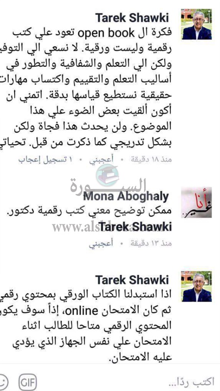 واضاف "شوقي"، في تصريحات صحفية خلال تعليق له على صفحة الدكتور طارق نورالدين، معاون وزير التربية والتعليم الاسبق، بموقع التواصل الاجتماعي "فيس بوك"، إن الفكرة تعود إلى الكتب الرقمية وليس الورقية، مشيرا الى أنه يريد التعلم والشفافية ولا يريد التوفير، مؤكدا أن ذلك تطوير في أساليب التعليم والتقييم واكتساب مهارات حقيقة، نستطيع قياسها بدقة.