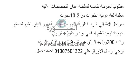 تعلن مدرسة خاصة في سلطنة عمان عن وظائف جديدة للمعلمين والمعلمات بمرتبات تصل إلي 7 ألف جنيه وذلك وفقا لنص الإعلان التالي:-