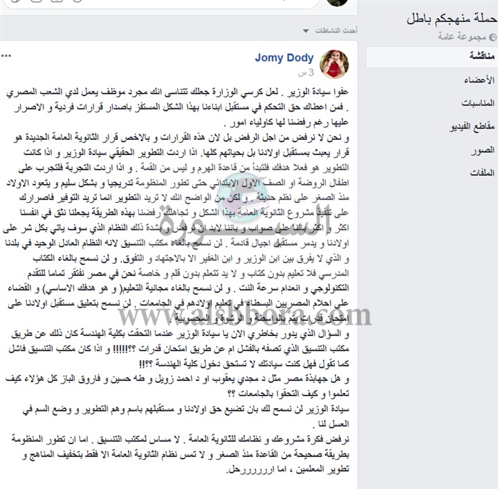 وقالت دعاء جمال إحدي أولياء الأمور علي جروب "حملة منهجكم باطل" علي موقع التواصل الاجتماعي "فيسبوك" : "عفوا سيادة الوزير لعل كرسي الوزارة جعلك تتناسى انك مجرد موظف يعمل لدي الشعب المصري ."
