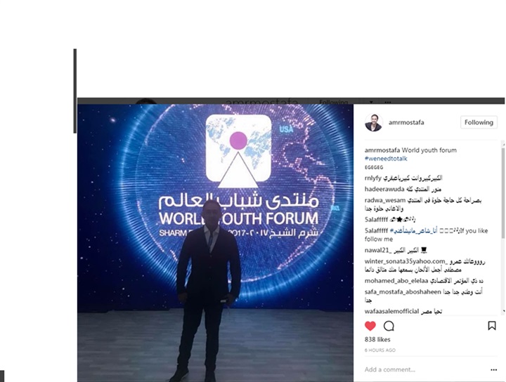 عمرو مصطفي ينشر صوره له علي "إنستجرام"من فعاليات منتدي شباب العالم