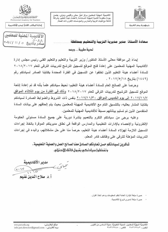 الاكاديمية المهنية: فتح باب التسجيل الالكترونى للمعلمين للتسجيل للترقية بدءاً من يوم الثلاثاء 7 / 11